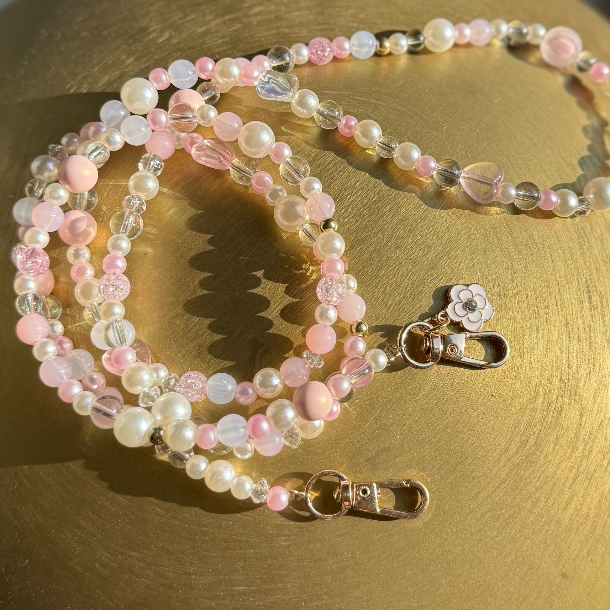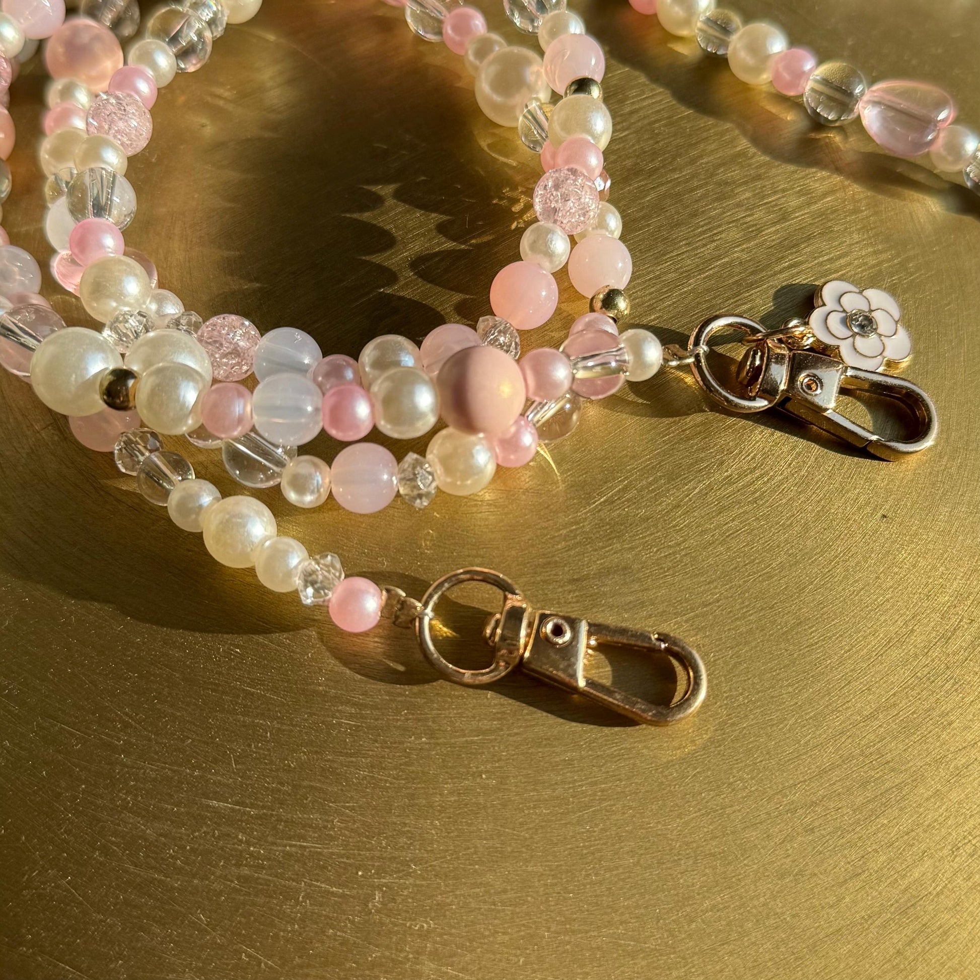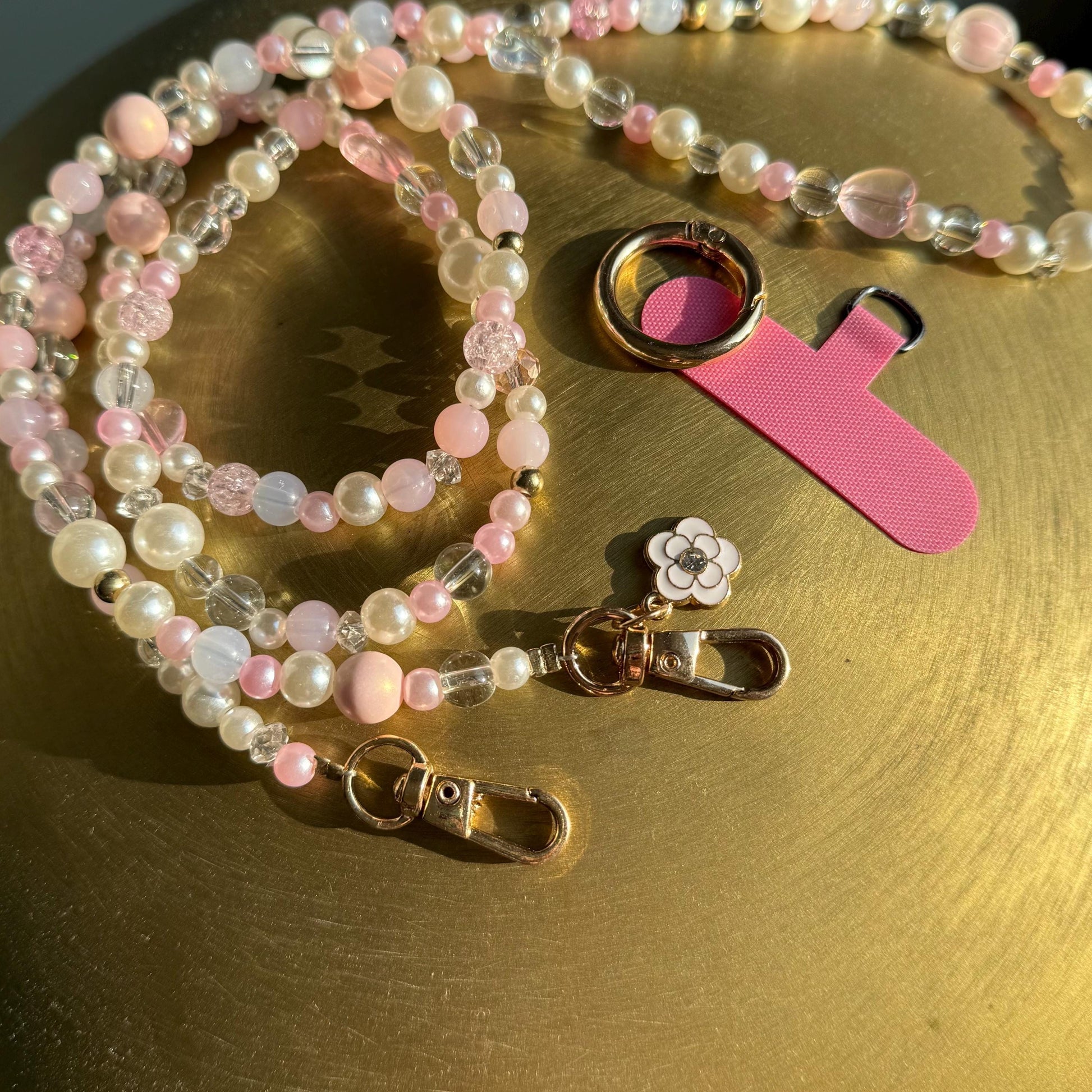 Dripping in dreamy pinks, glossy pearls, sparkly crystals, and the cutest little hearts, this hand-beaded beauty is all about that soft-girl glow. Finished with a sweet camellia charm and packed with personality, it’s giving main character energy, on and off your phone. Wear it crossbody for hands-free slayage or let it dangle for pure aesthetic vibes.