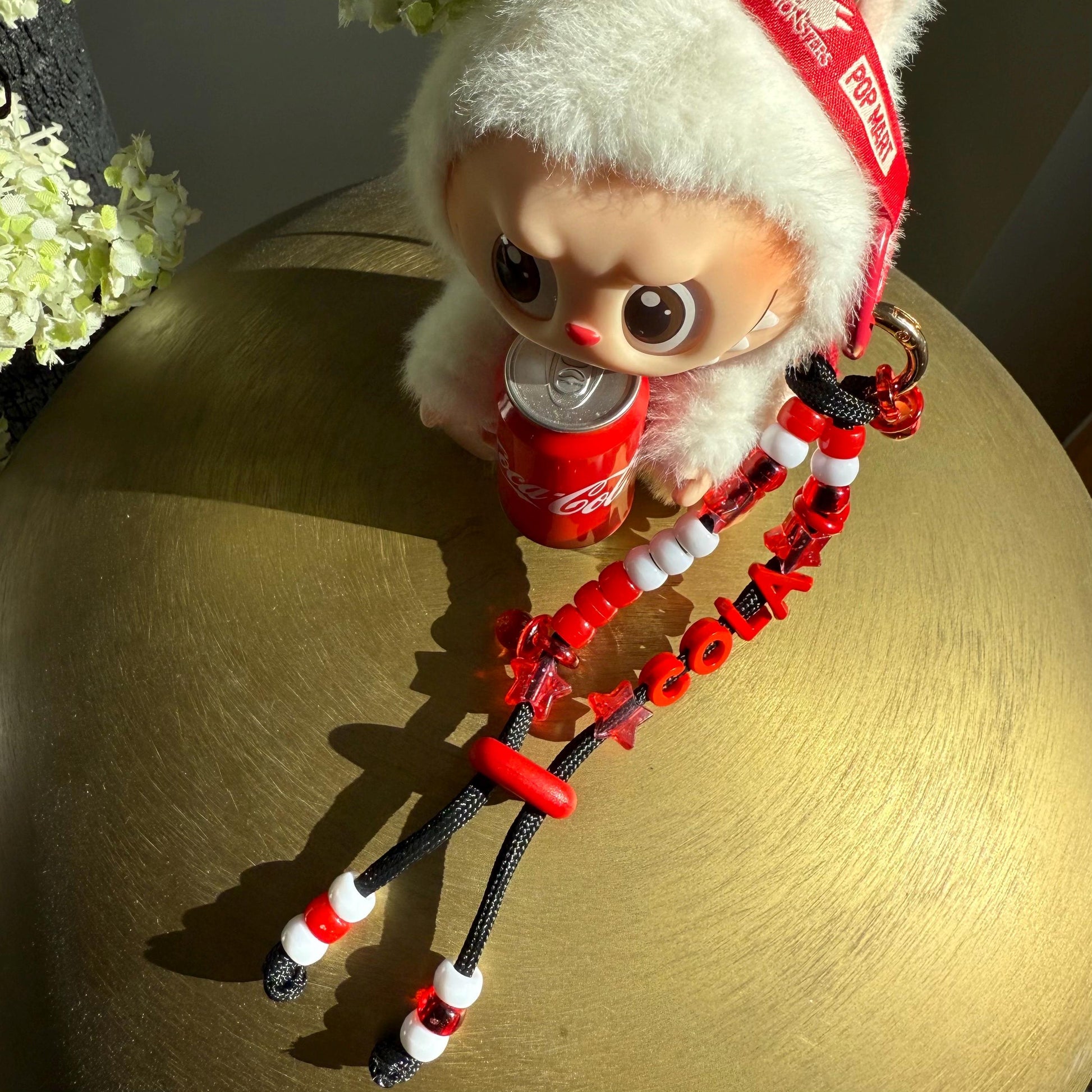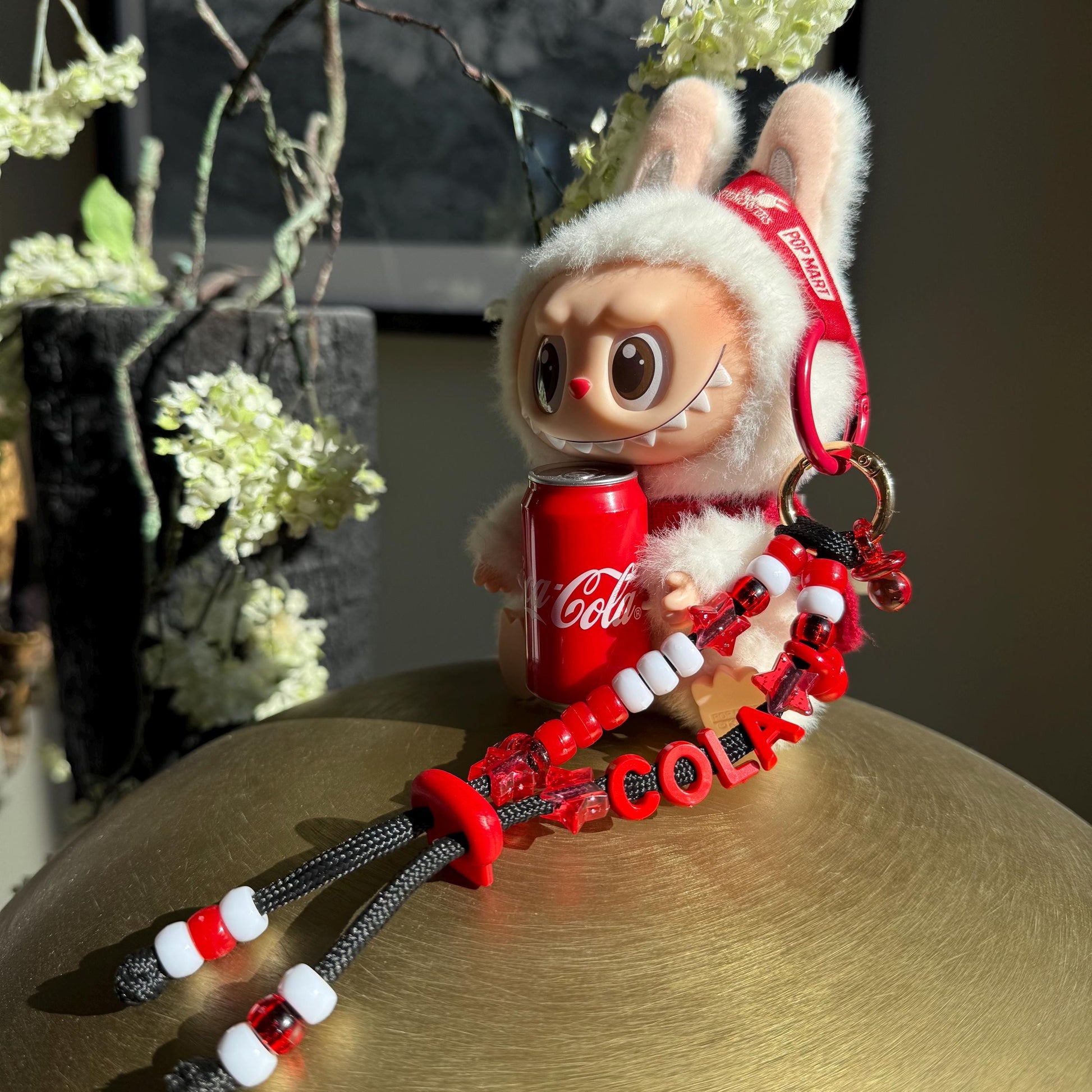 Perfectly blending the iconic red-and-white color palette of Coca-Cola with playful retro vibes, this accessory features a detailed beaded lanyard with the word “COLA” spelled in bold letters, accented by star beads, transparent elements, and a secure keyring. Whether you attach it to your keys, bag, or your favorite POP MART collectible (like the Labubu in the photo!), this keychain adds a fun, eye-catching statement. It’s a perfect gift for Coca-Cola fans, lovers of kawaii culture, or anyone who enjoys collectible-style accessories with a personal touch.