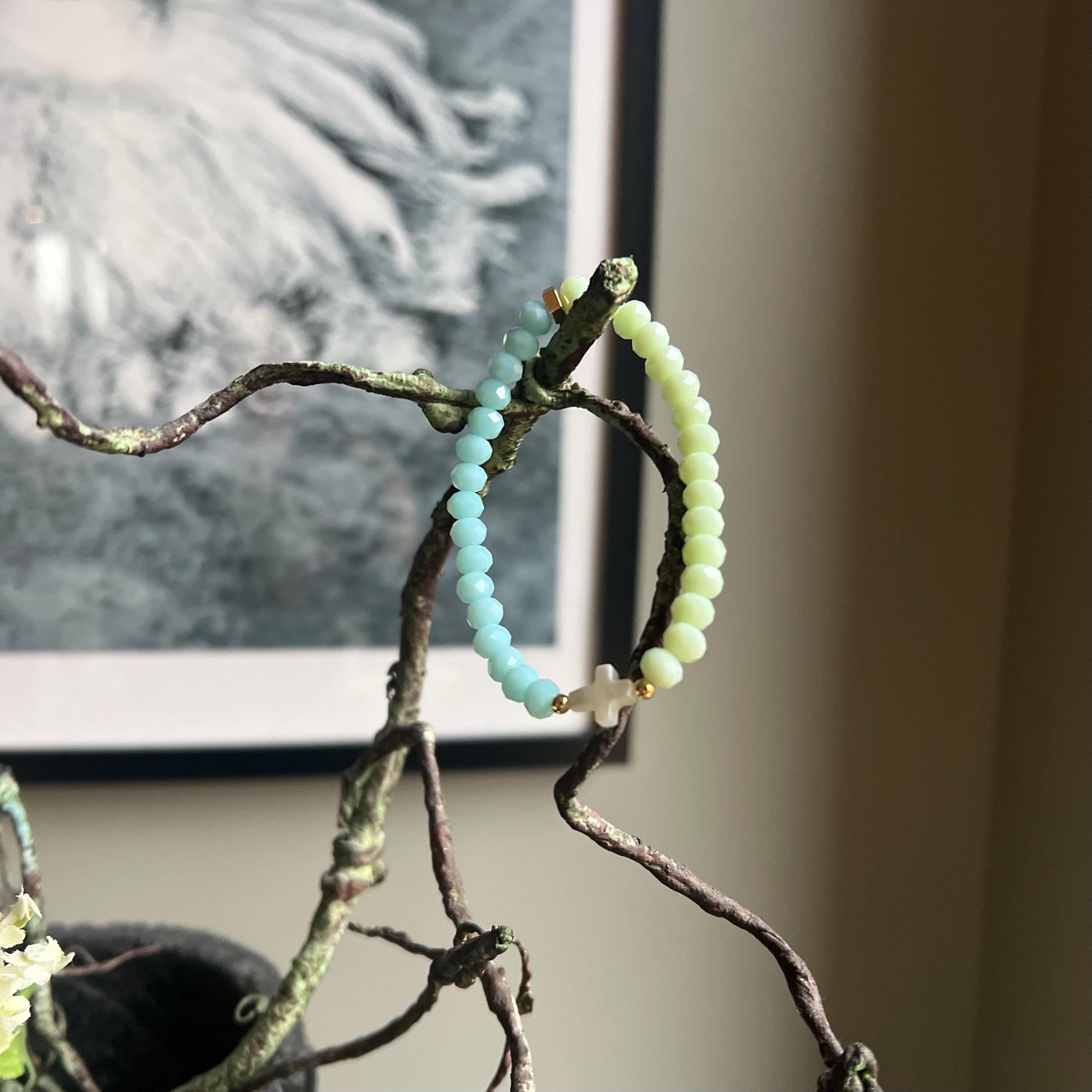 A delicate and serene masterpiece, this piece is crafted with alternating mint green and baby blue beads, their soft hues evoking the tranquil beauty of a spring morning sky. The beads are punctuated with shimmering gold spacer beads, their warm glow adding a touch of elegance and sophistication. At its centre rests a thin, luminous mother-of-pearl cross, radiating gentle iridescence with every movement, symbolizing purity and grace. The design is finished with a gold wheel detail, subtly anchoring the composition with timeless charm. This creation is a harmonious blend of softness and brilliance, embodying both peace and divine beauty.