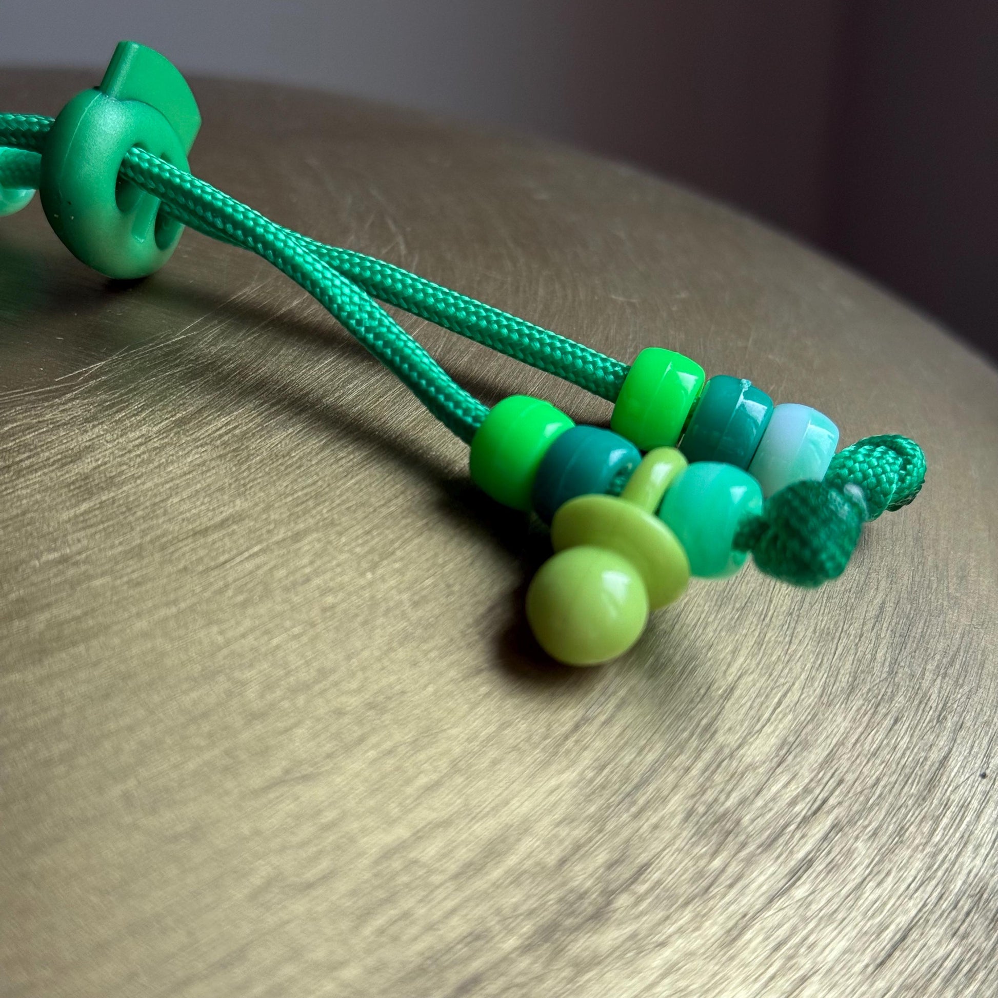 A vibrant, handcrafted accessory designed to bring nostalgic joy and fresh flair. This version features a crisp, green-toned palette with glossy beads, pastel hearts, translucent stars, and the ultimate throwback: a mini retro dummy beads – a sweet nod to childhood collectibles.