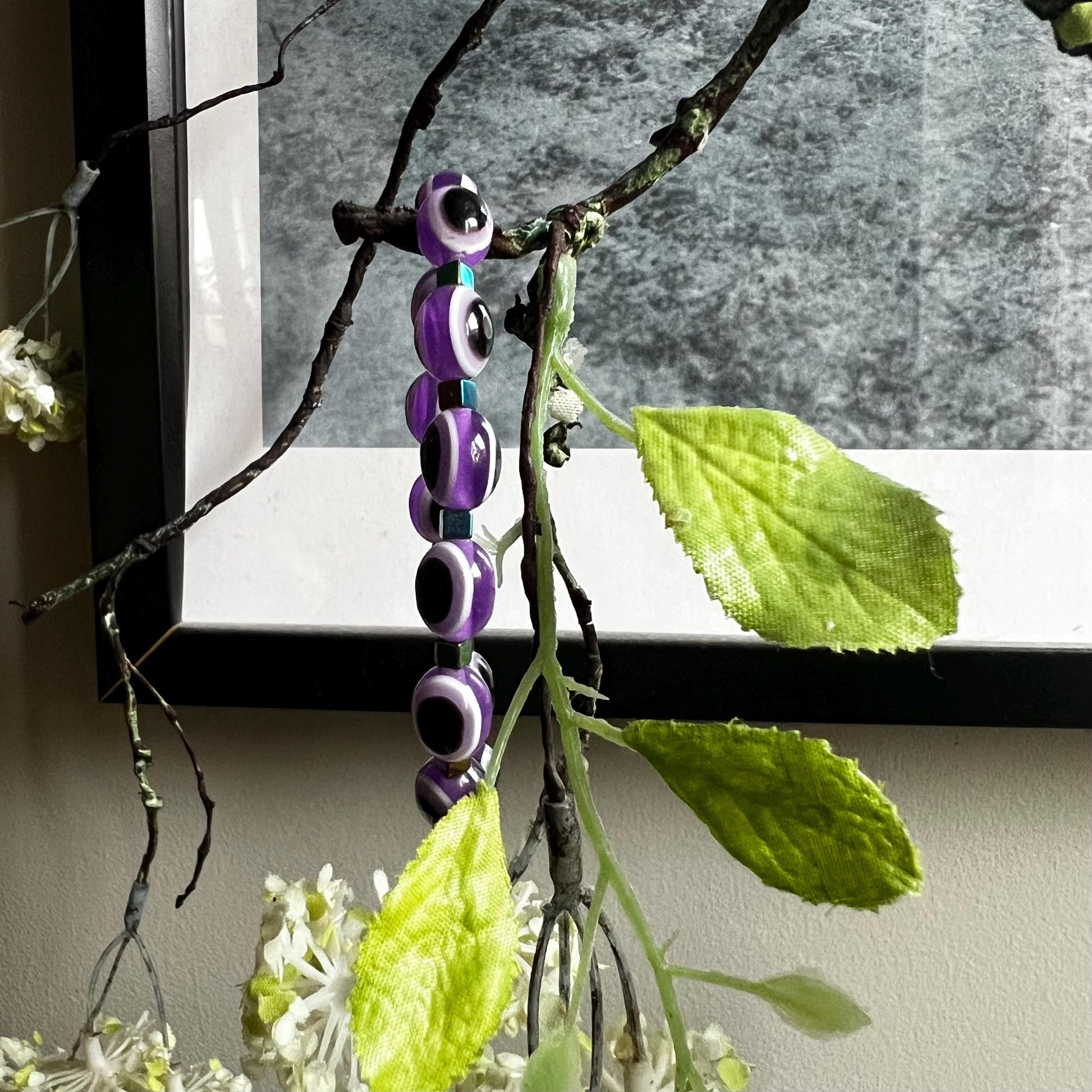 Protection with a Pop of Purple This stunning evil eye bracelet features vibrant 10mm purple evil eye beads paired with semi-precious gemstones on a comfortable, stretchy cord. Designed to ward off negativity, it’s both a protective charm and a stylish statement.