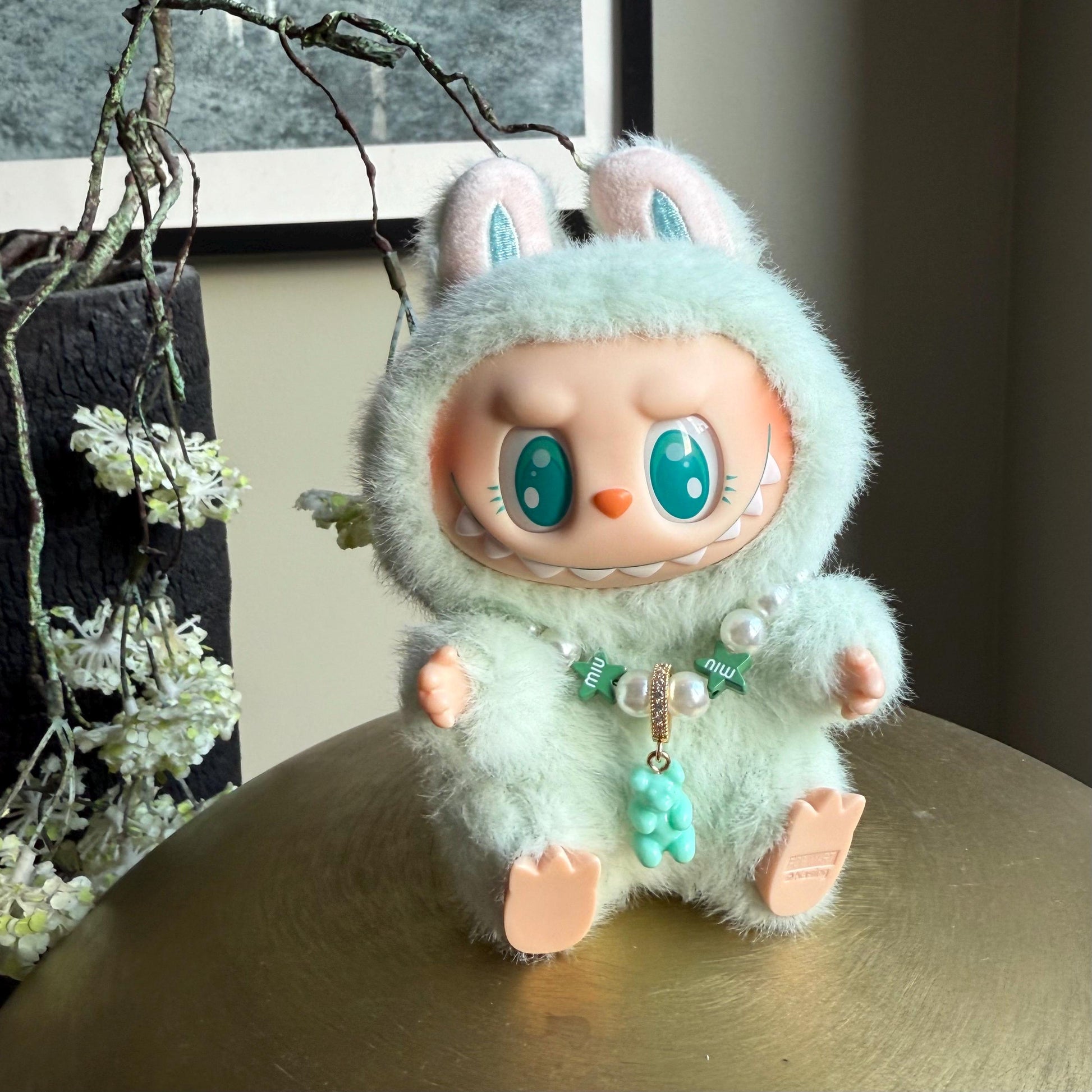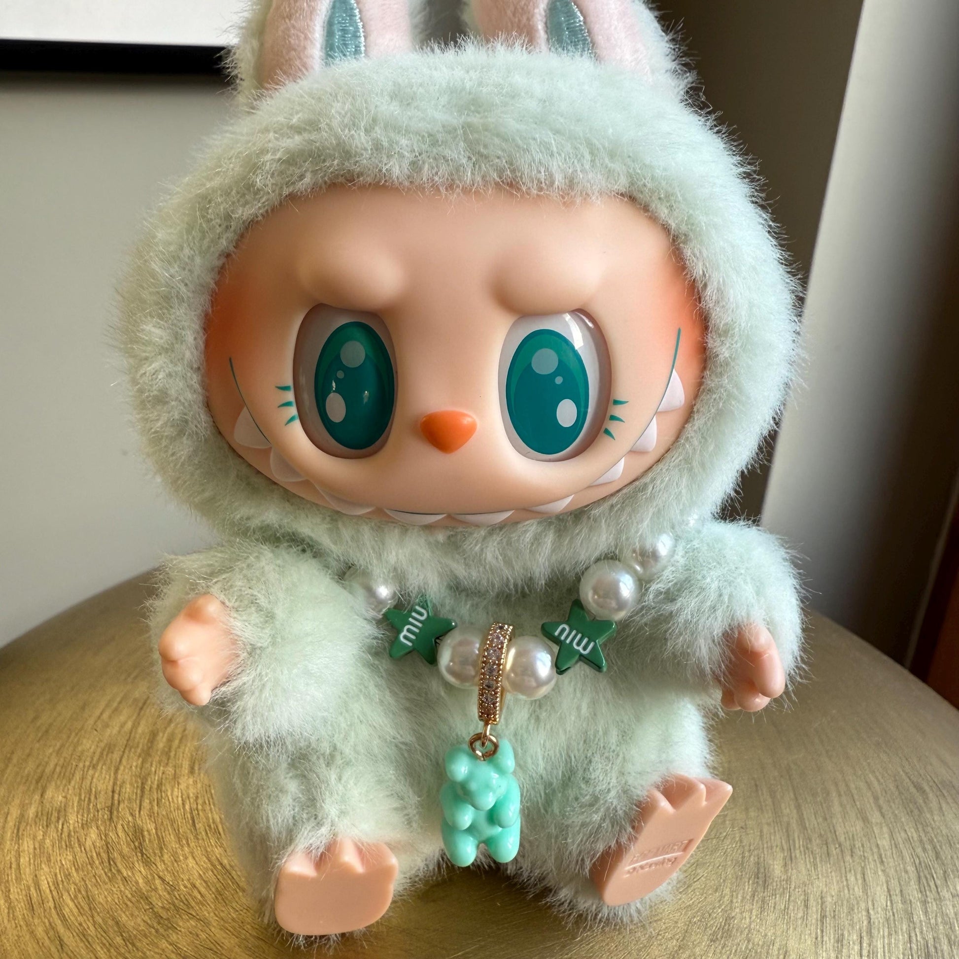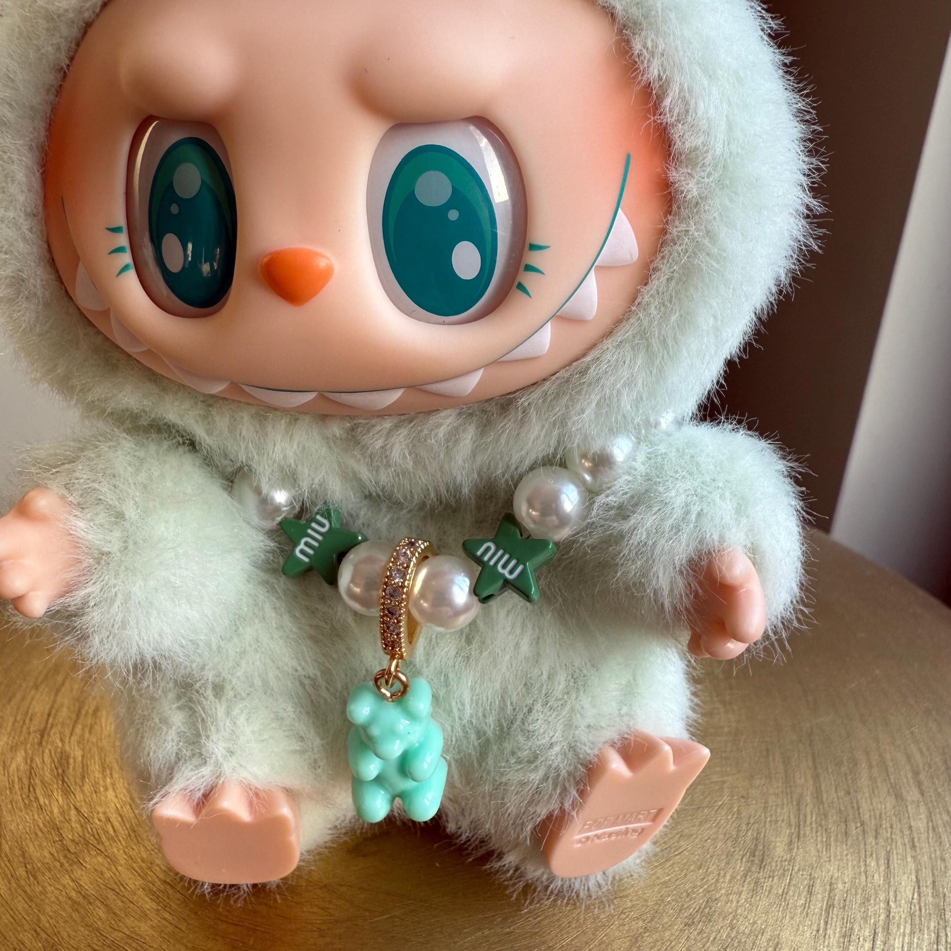Add a touch of charm to your QUQU Labubu collection with this limited-edition handmade necklace, designed especially for Pop Mart’s Have a Seat Bubu series. Inspired by Miu Miu’s playful luxury, each piece is crafted with love, featuring high-quality faux pearls, delicate gold spacer bead, and a glossy Green gummy bear charm and the stunning Miu Miu stars — the perfect finishing touch for your collectible figure.