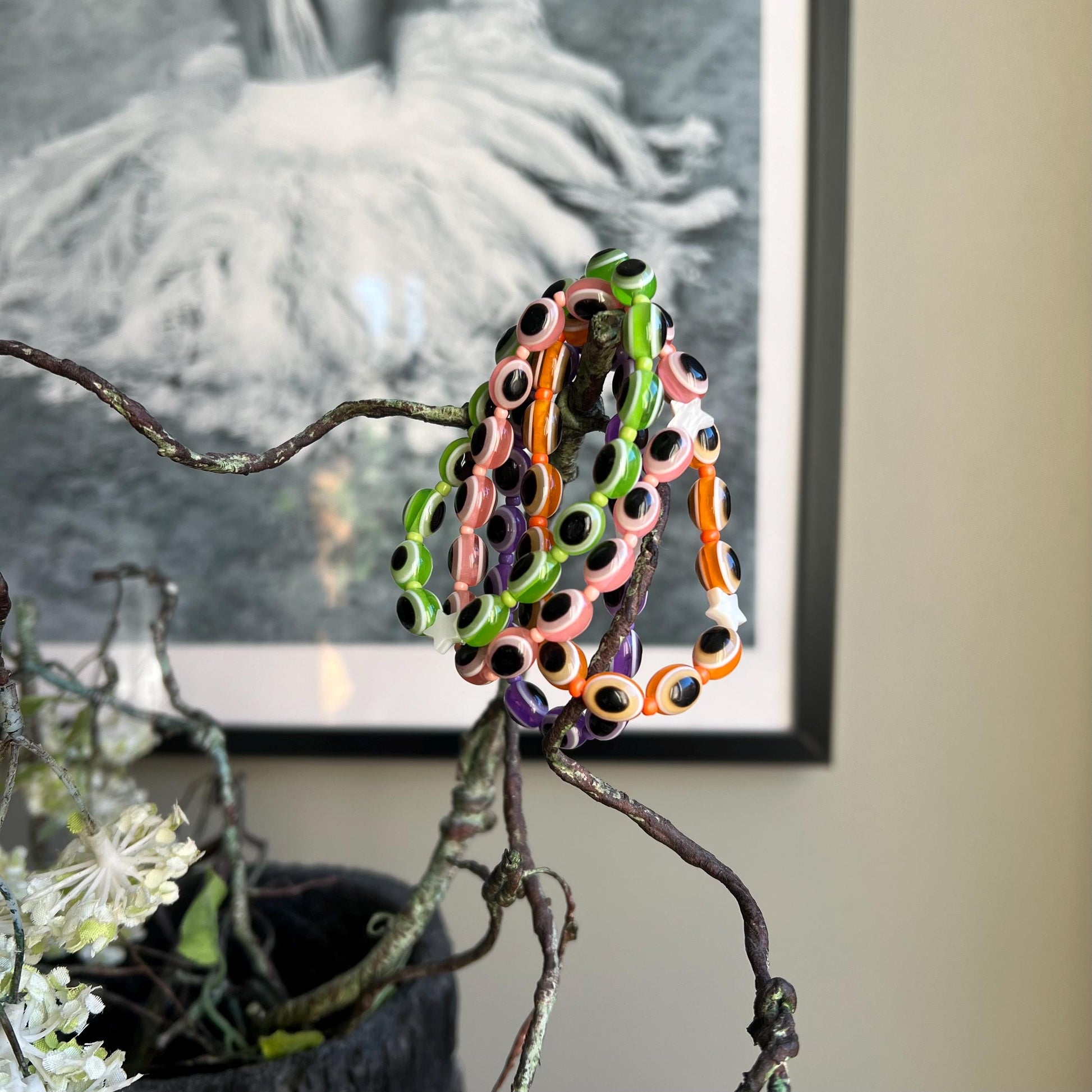 Indulge in a kaleidoscope of colour with our Starburst Evil Eye Bracelet, where vibrant charm meets celestial beauty! Inspired by the juicy, cheerful hues of Starburst sweets, these bracelet bursts with life through radiant evil eye beads perfectly paired with delicate seed beads in matching tones. At its heart, a luminous mother-of-pearl star adds a touch of cosmic elegance, creating a playful yet meaningful accessory.